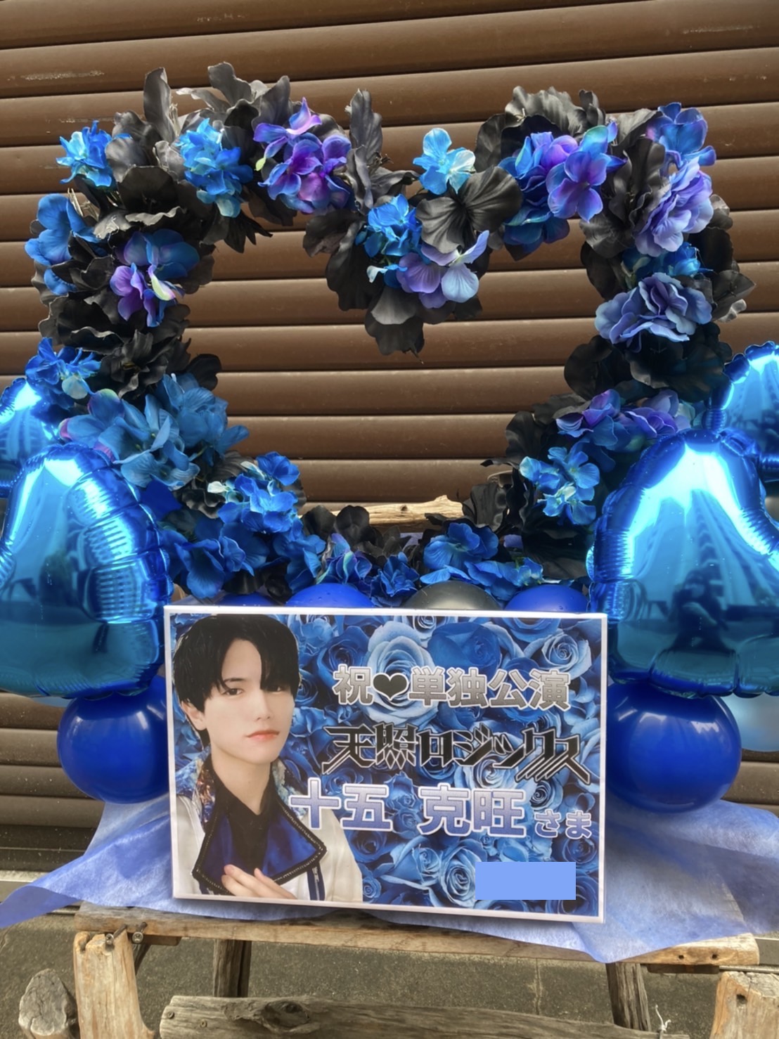 天照ロジックス単独ライブを彩る、クールな青と紫のハート型フラスタ。十五克旺さまのパネルが目を引く豪華なデザイン。