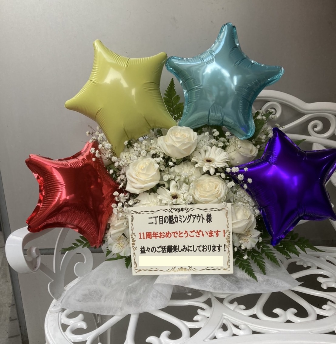白い生花をベースに、カラフルな星バルーンが華やかさを添えるフラスタ。11周年記念のお祝いにふさわしい明るい雰囲気です。