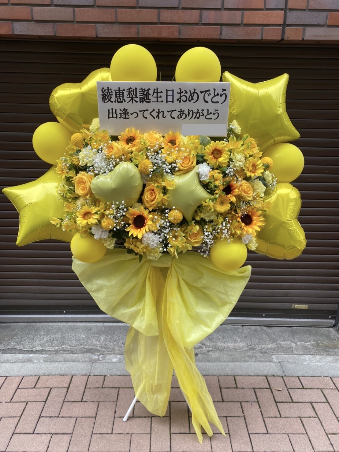 江嶋綾恵梨さんの生誕祭をお祝いする、黄色で統一されたフラスタ。ひまわりとバラの生花に、大小のバルーンが加わり、明るく華やかな雰囲気を演出しています。