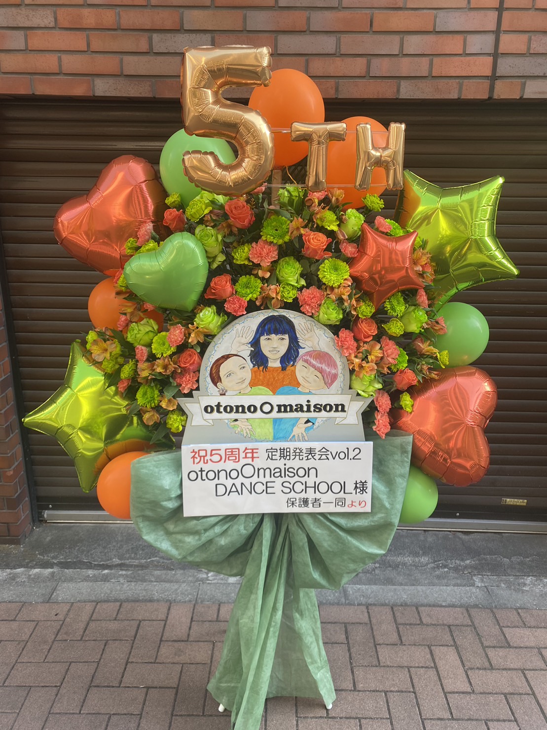 ダンス発表会に贈られた、オレンジとグリーンの鮮やかなフラスタ。5周年のお祝いとエネルギッシュな雰囲気が伝わります。