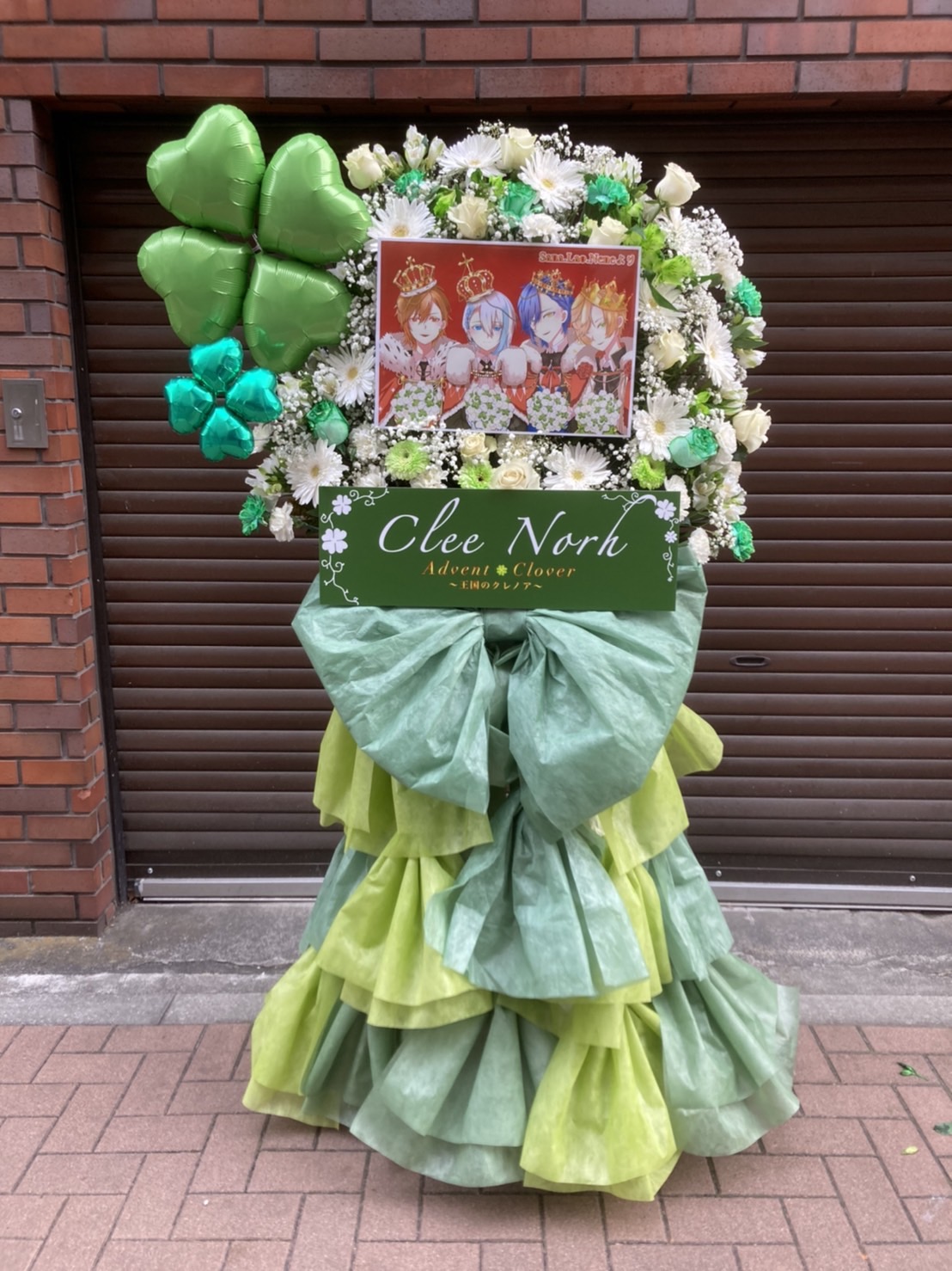 クレノア2ndワンマンライブへ贈られた、緑と白が基調のフラスタ。四つ葉のクローバーバルーンや豪華な生花、ライムグリーンのフリルで、可愛らしく華やかな雰囲気を演出しています。
