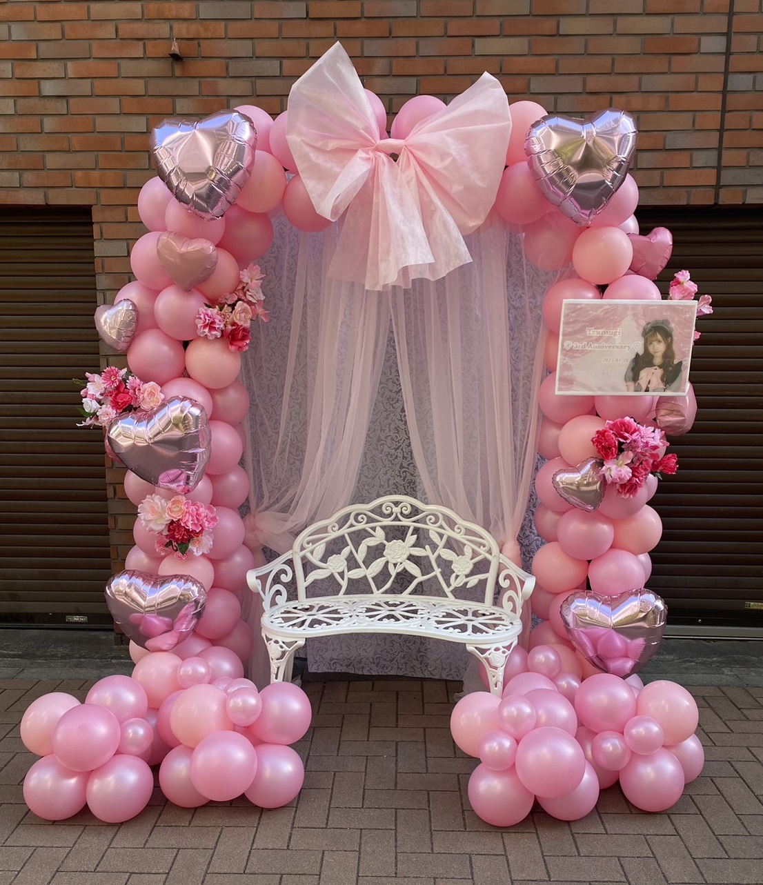 つむぎ3周年記念イベントを彩る、ピンクが基調のロマンチックなバルーンフラスタ。白いベンチとハートのバルーンが可愛らしい空間を演出しています。