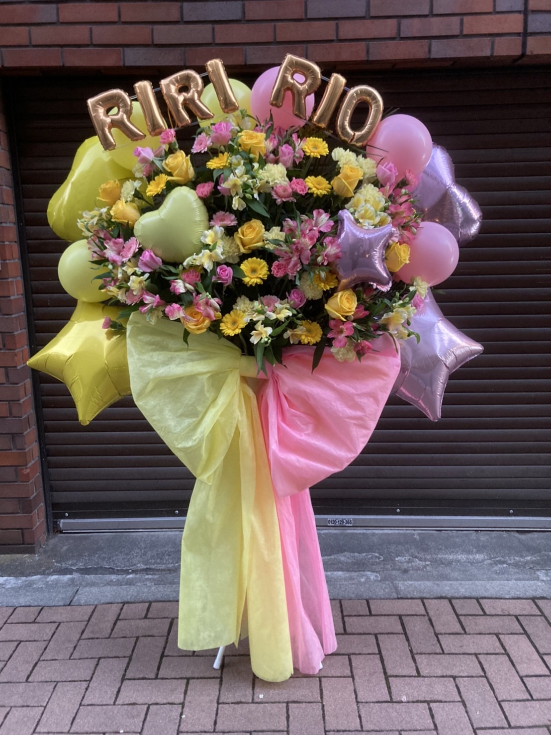 黄色とピンク、パステルカラーのバルーンと生花が織りなす、華やかで可愛らしいフラスタです。会場を明るく彩ります。