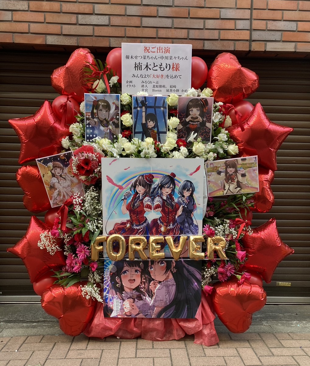 赤とピンクの生花とバルーンが華やかで情熱的なフラスタ。優木せつ菜と楠木ともりさんへの熱い応援が伝わる、愛に満ちたデザインです。