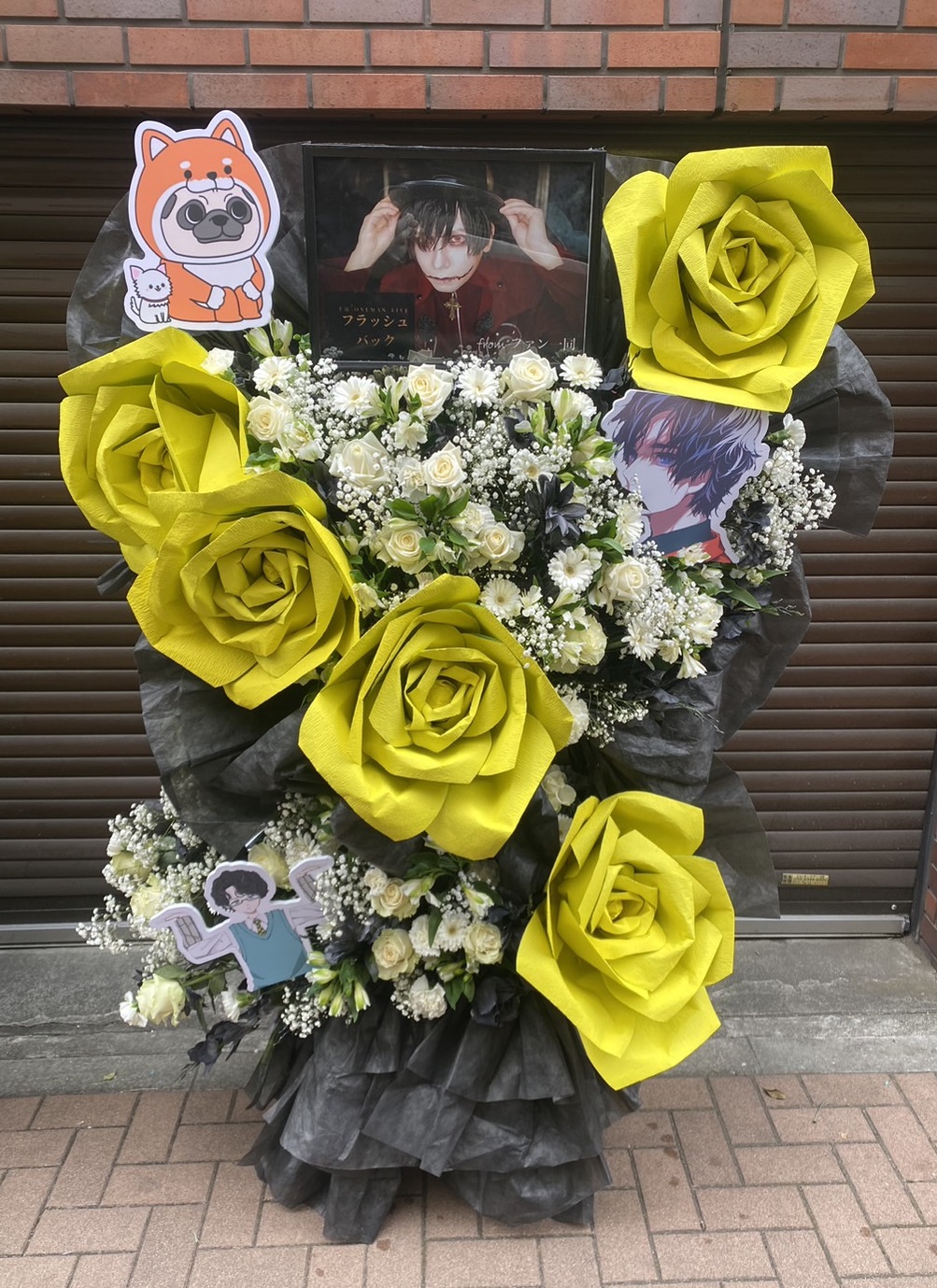 千吊ONE MAN LIVE フラッシュバック開催祝いフラスタ。鮮やかな黄色の造花と白生花、黒いラッピングでクールかつ華やかな印象。