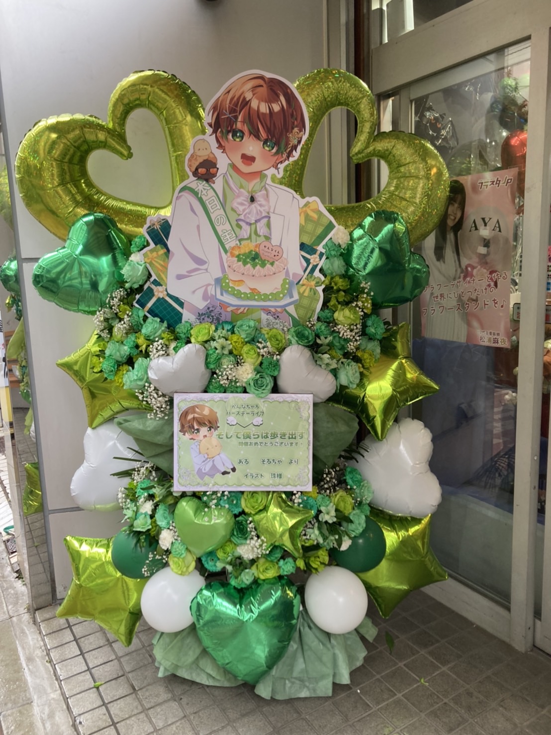 鮮やかな緑と白を基調とした、爽やかで華やかなフラスタ。キャラクターパネルが目を引くお祝いムード満点の一基です。