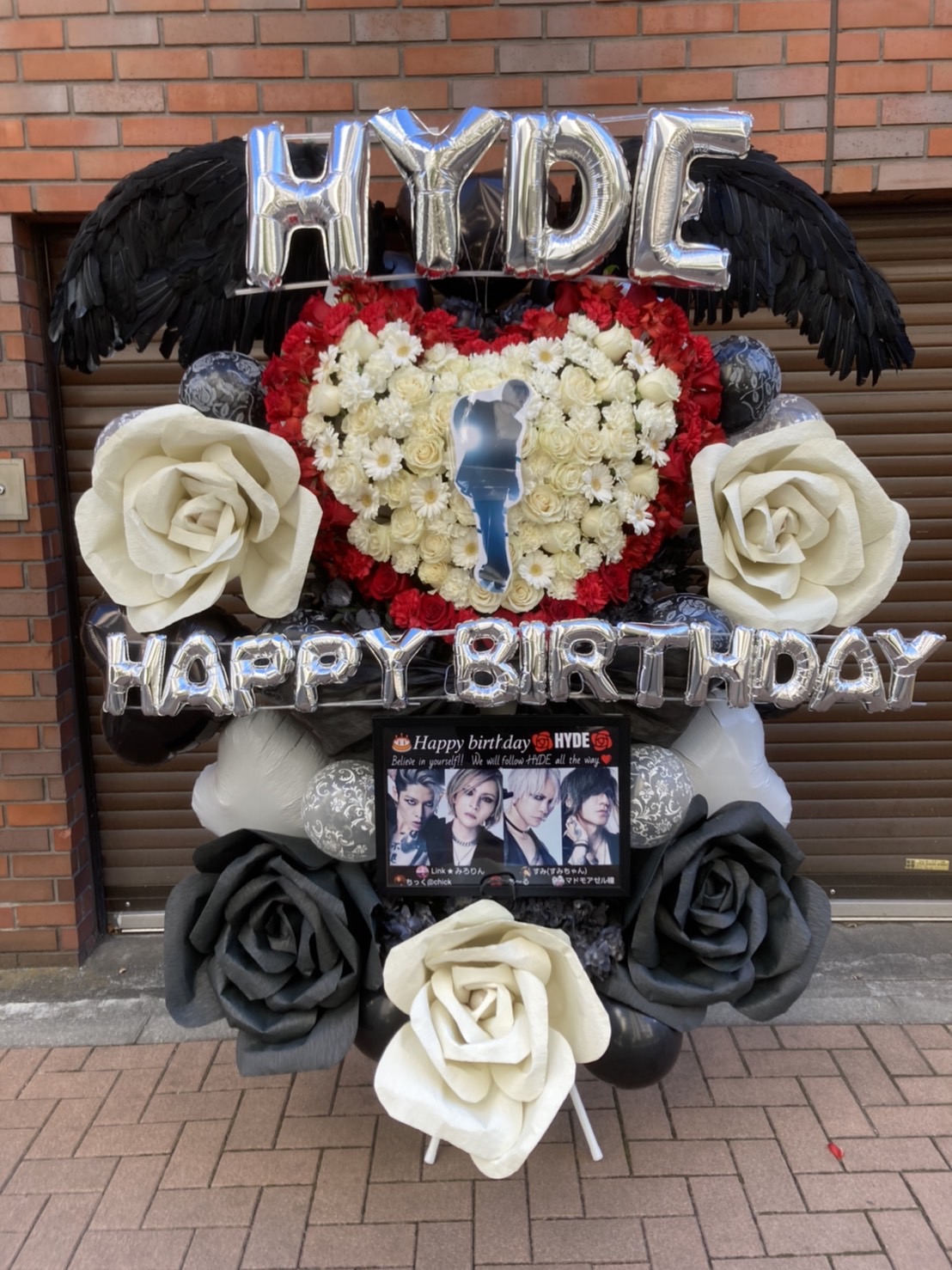 赤と白のハートに、黒い翼とバラが映えるHYDEさんの生誕祭フラスタ。ロックで情熱的な雰囲気が魅力です。