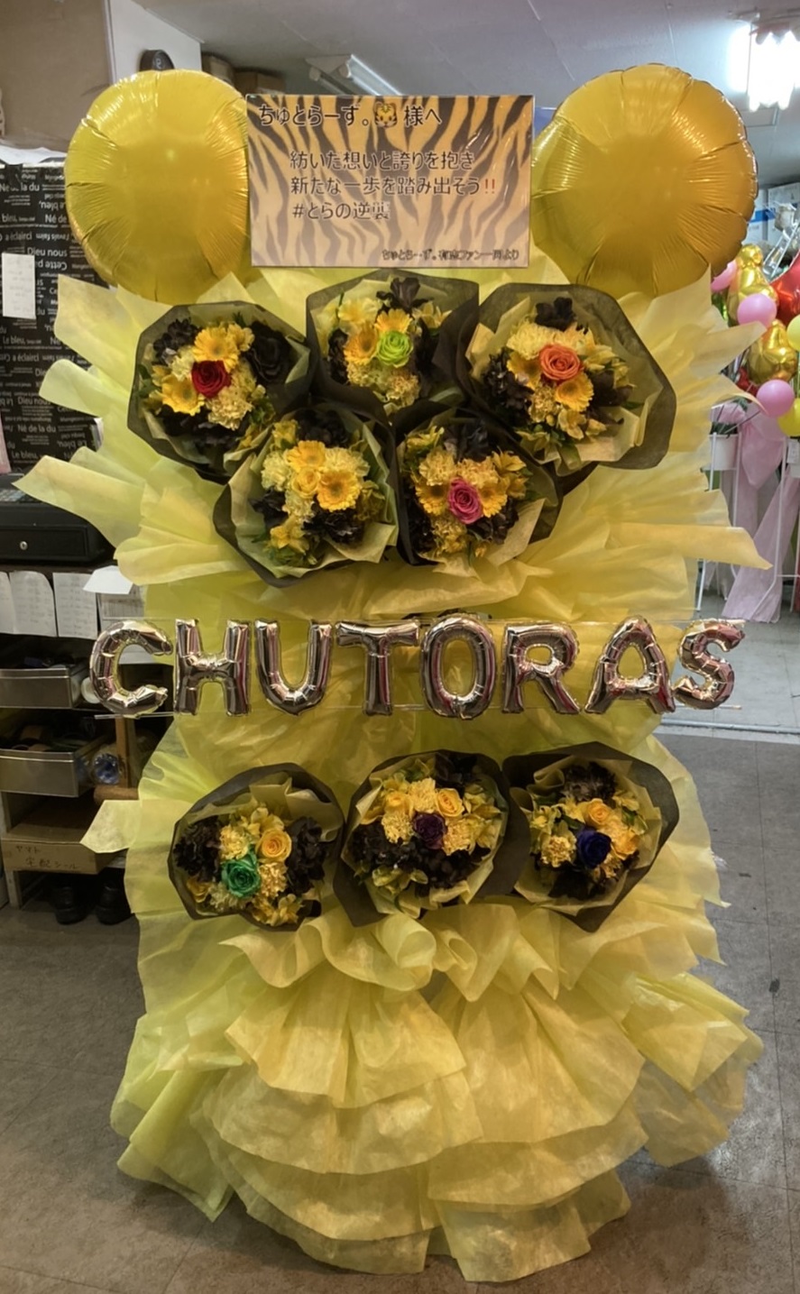 UNIDOL決勝戦へ向け、黄と黒を基調に虎柄パネルとカラフルな生花でCHUTORASを応援。バルーンも加わり、勝利への力強い想いが伝わる華やかなフラスタ。