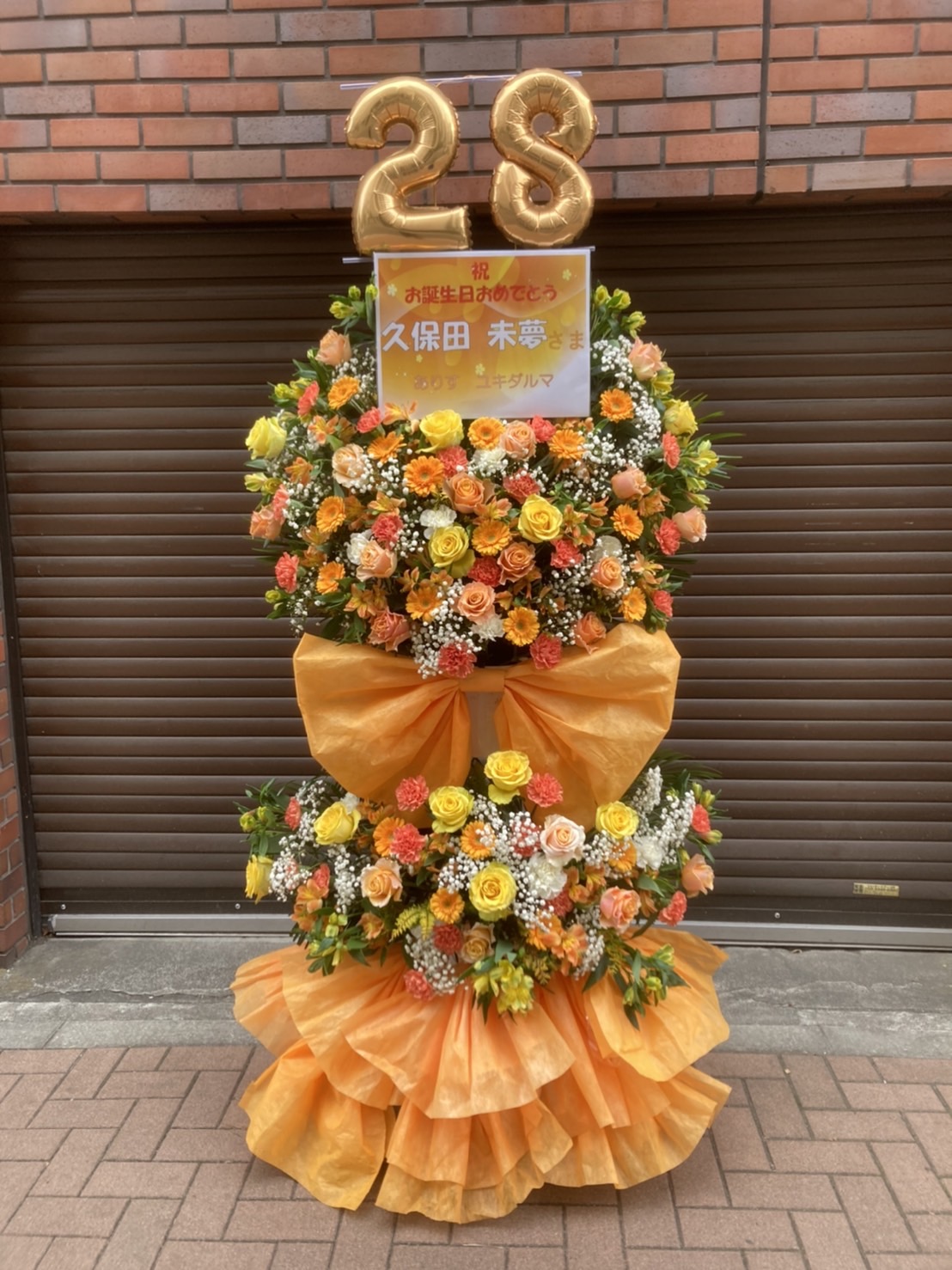 みーとゆー公録イベント会場を彩る、久保田未夢さまへのお誕生日フラスタ。オレンジと黄色が織りなす華やかな生花に、28のバルーンが目を引きます。