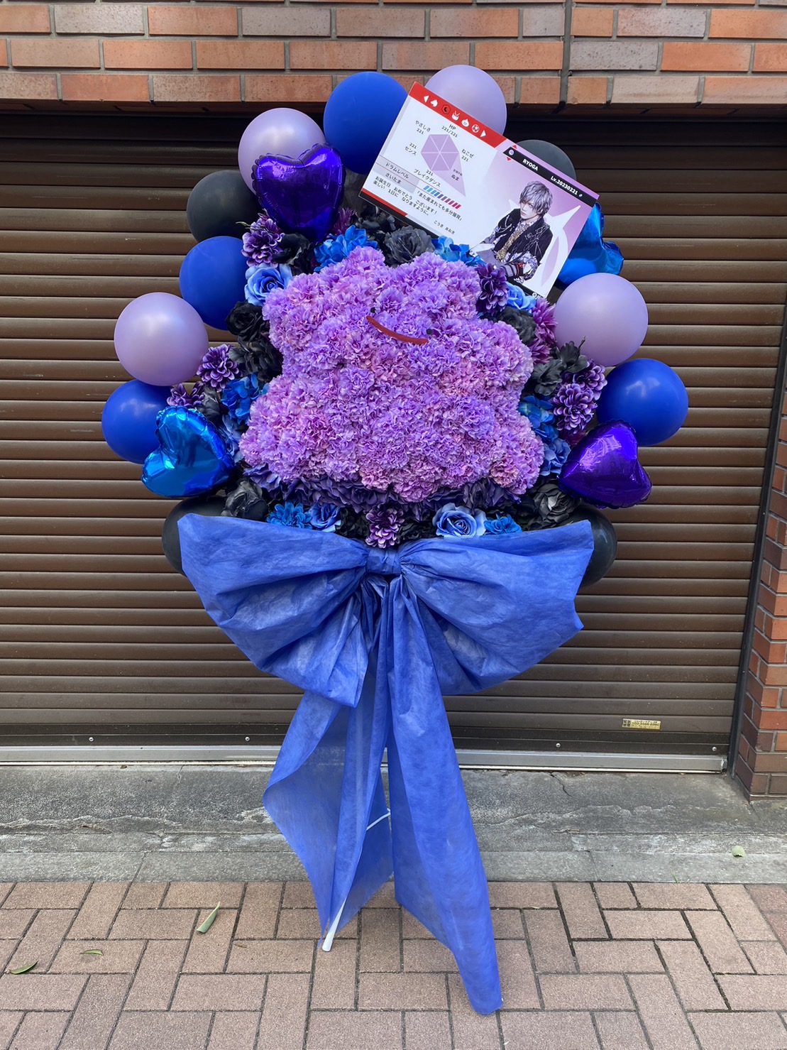 零[Hz] RYOGA様の生誕祭フラスタ。紫と青、黒を基調としたクールで華やかなデザイン。可愛らしいくまの生花が目を引きます。