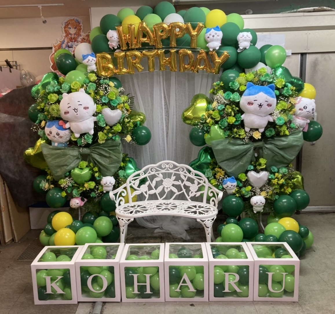 緑と黄がメインカラーの朝比奈こはる生誕祭フラスタ。生花とバルーンが可愛らしいキャラクターを囲み、爽やかで温かい祝福ムードを演出。