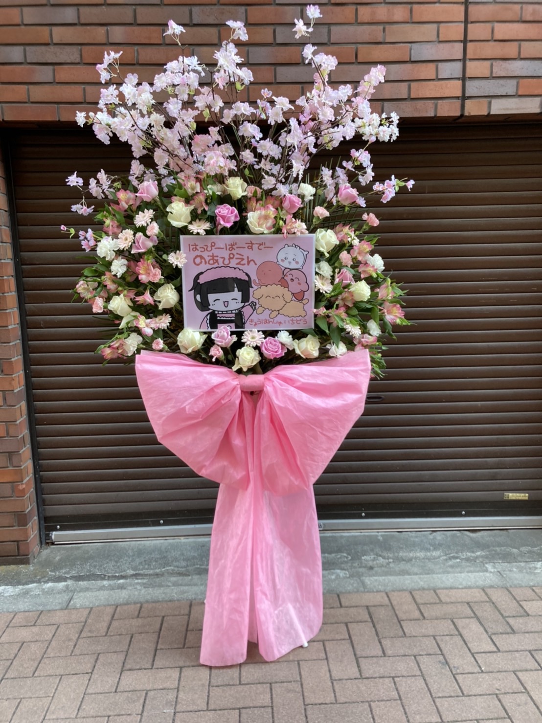 ピンクと白の生花で彩られた可愛らしいフラスタ。キャラクターパネルがアクセントとなり、温かい生誕祭の雰囲気を演出しています。