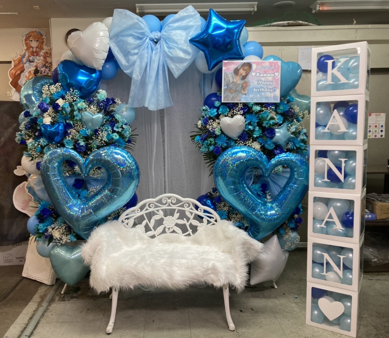 青と白を基調とした、ハートのバルーンと生花が華やかなフラスタ。中央のベンチと名前入りボックスが特別な生誕祭を彩ります。