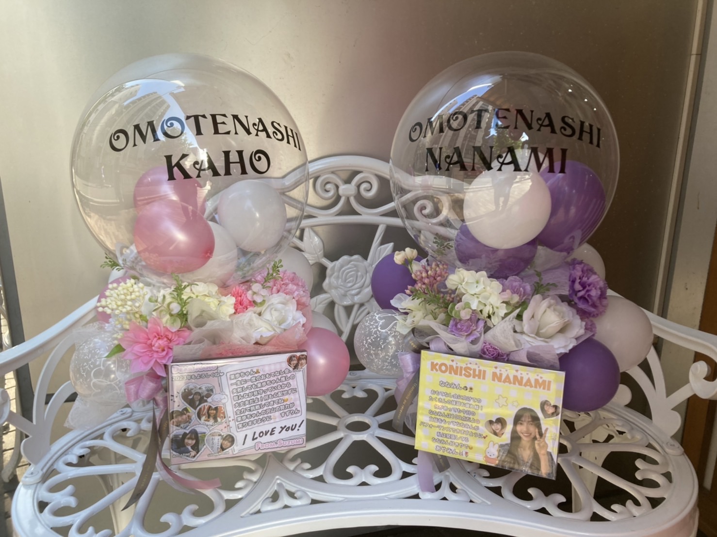 日向坂46四期生へのおもてなし会フラスタ。ピンクと紫、白を基調としたバルーンと造花で、華やかで可愛らしい雰囲気を演出しています。