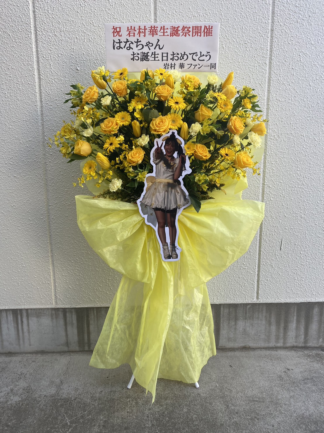 岩村華さんの生誕祭を祝う、鮮やかな黄色の生花フラスタ。主役のパネルが目を引く、明るく華やかなデザインです。