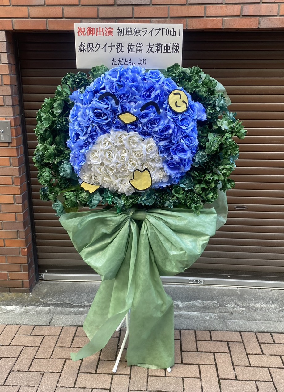 青と白の花で描かれた可愛いキャラクターフラスタ。鮮やかな緑が全体を引き立て、会場に華を添えるデザインです。