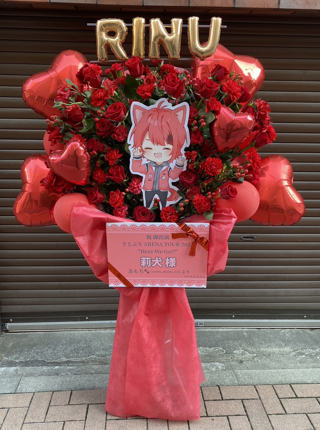 情熱的な赤を基調とした華やかなフラスタ。赤いバラとハートバルーンで飾られ、莉犬様のパネルが目を引きます。