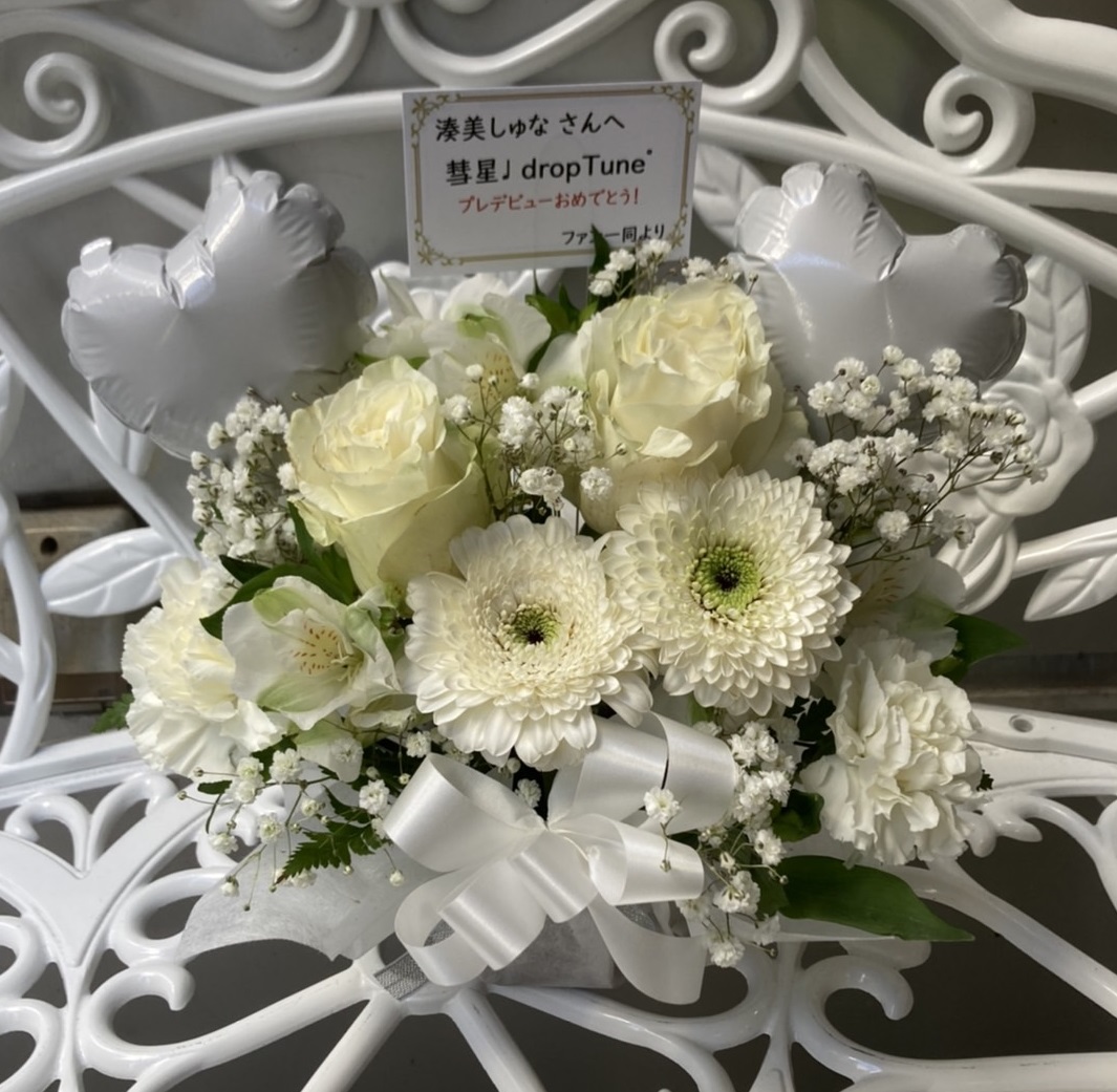 白一色でまとめられた上品なフラスタ。プレデビューをお祝いする、清らかで希望に満ちたデザインです。