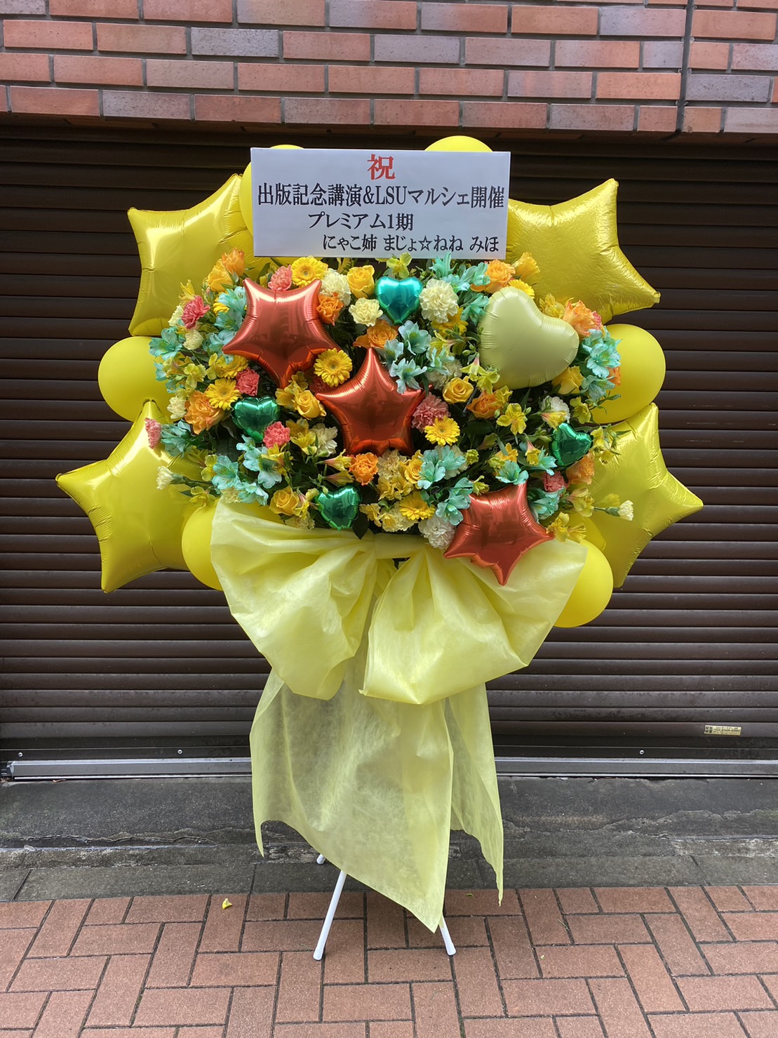 鮮やかな黄色を基調に、赤や水色のバルーンと色とりどりの生花が華やかなフラスタ。出版記念とマルシェの賑やかな雰囲気を祝福します。