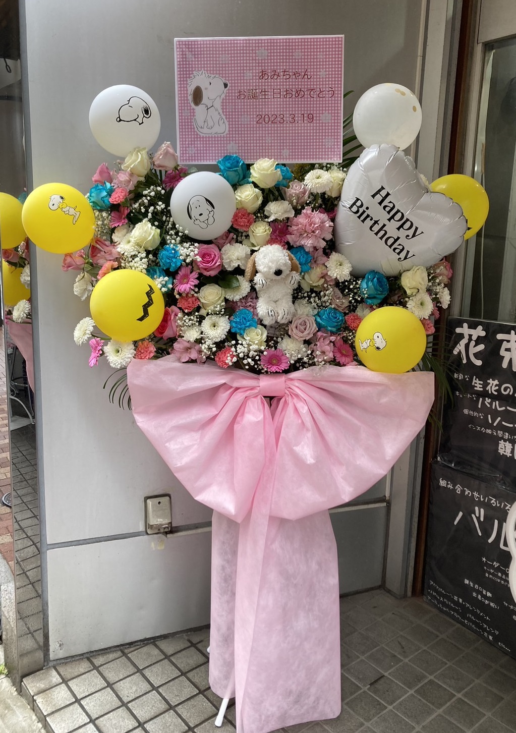 あみさんのお誕生日をお祝いする、ピンクと青を基調とした華やかなフラスタ。スヌーピーのバルーンが可愛いアクセントに。