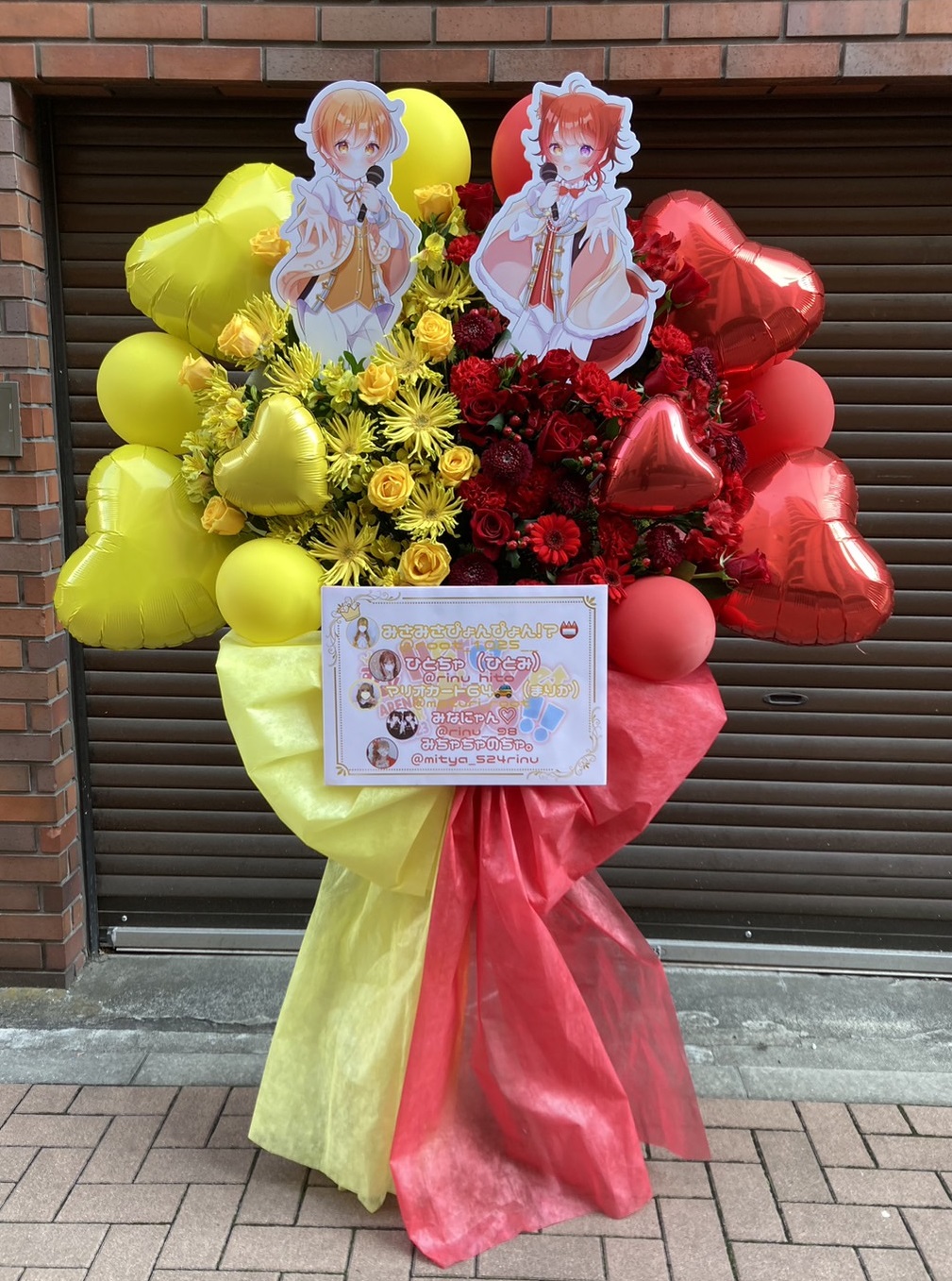 赤と黄色の鮮やかな色合いが目を引くフラスタ。キャラクターパネルと生花、バルーンで華やかにお祝いムード満点!