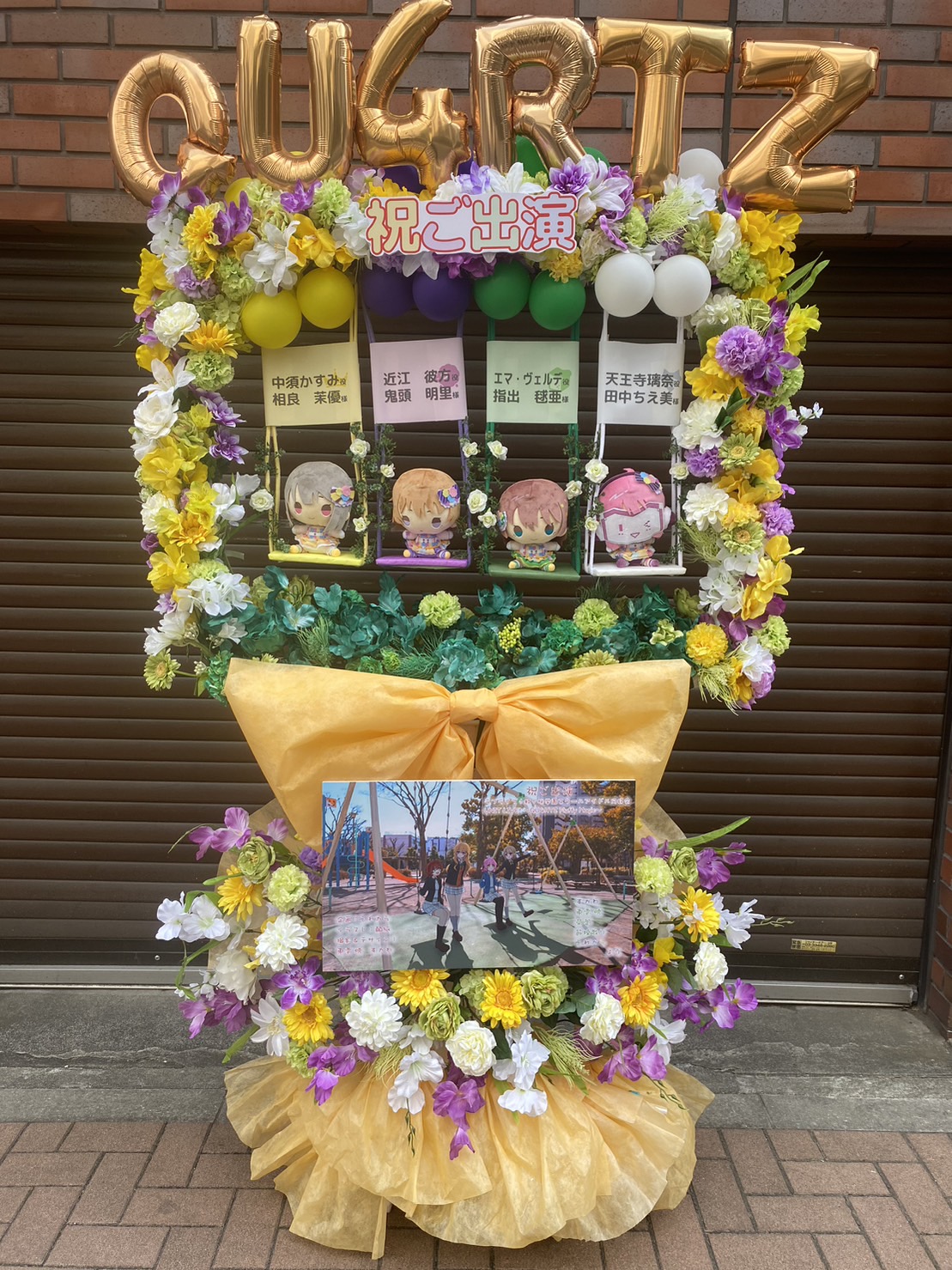 ラブライブ!虹ヶ咲QU4RTZユニットライブへ。メンバーカラーの黄・紫・緑・白を基調とした、バルーンと生花が華やかなフラスタ。可愛らしいキャラクターパネルが目を引きます。
