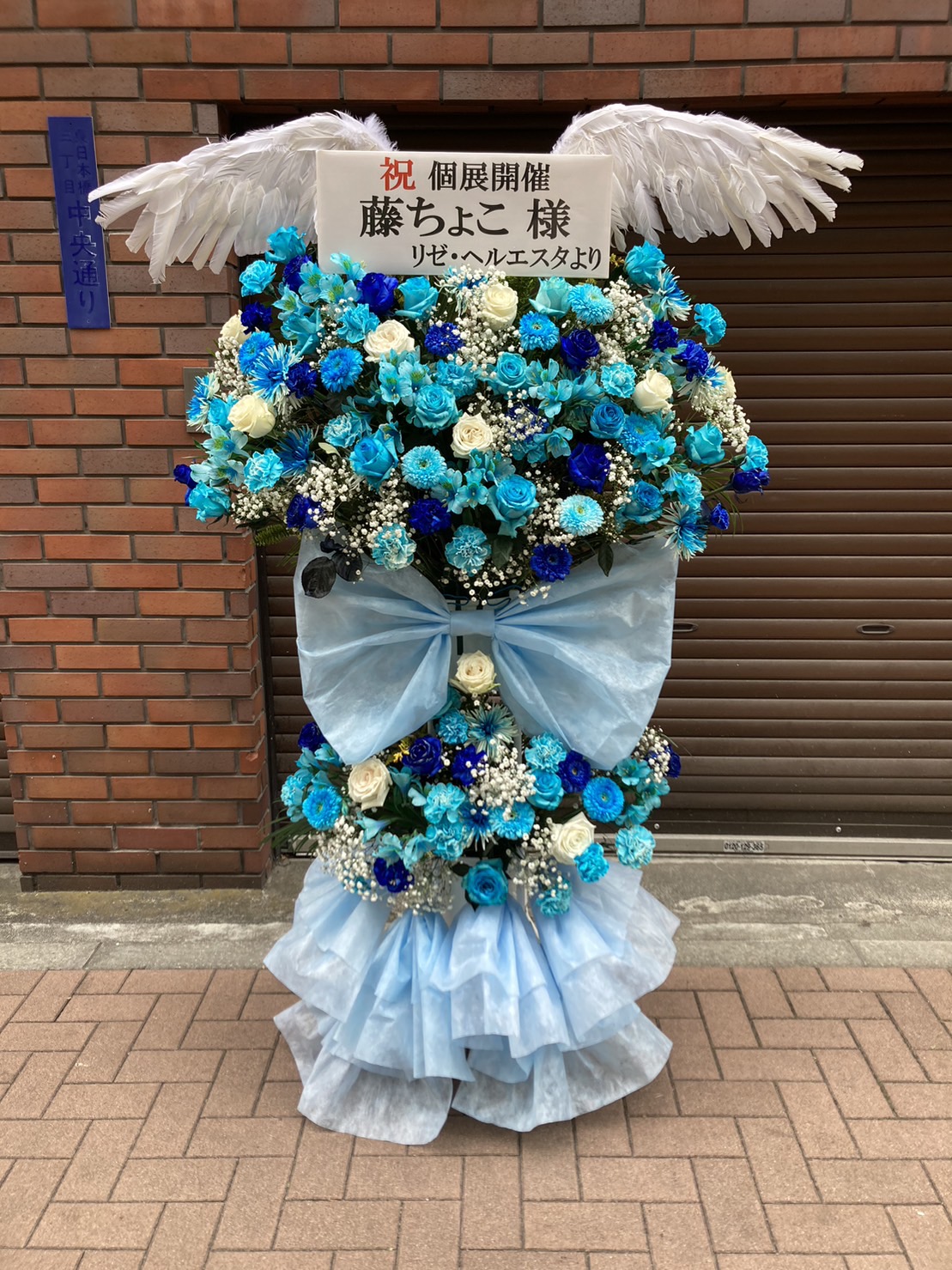 青と白の生花が織りなす幻想的なフラスタ。天使の羽が添えられ、爽やかで神聖な雰囲気を演出しています。