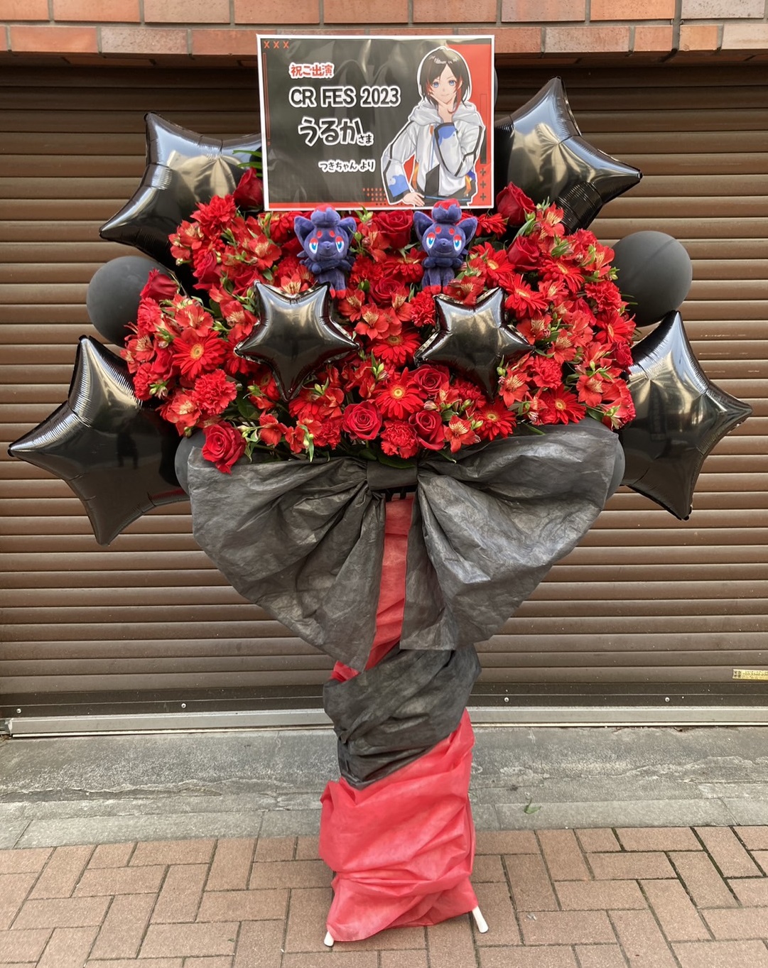 CR FES 2023 うろかさんへ贈られた、赤と黒で統一されたクールなフラスタ。生花と星形バルーンで華やかに飾られています。