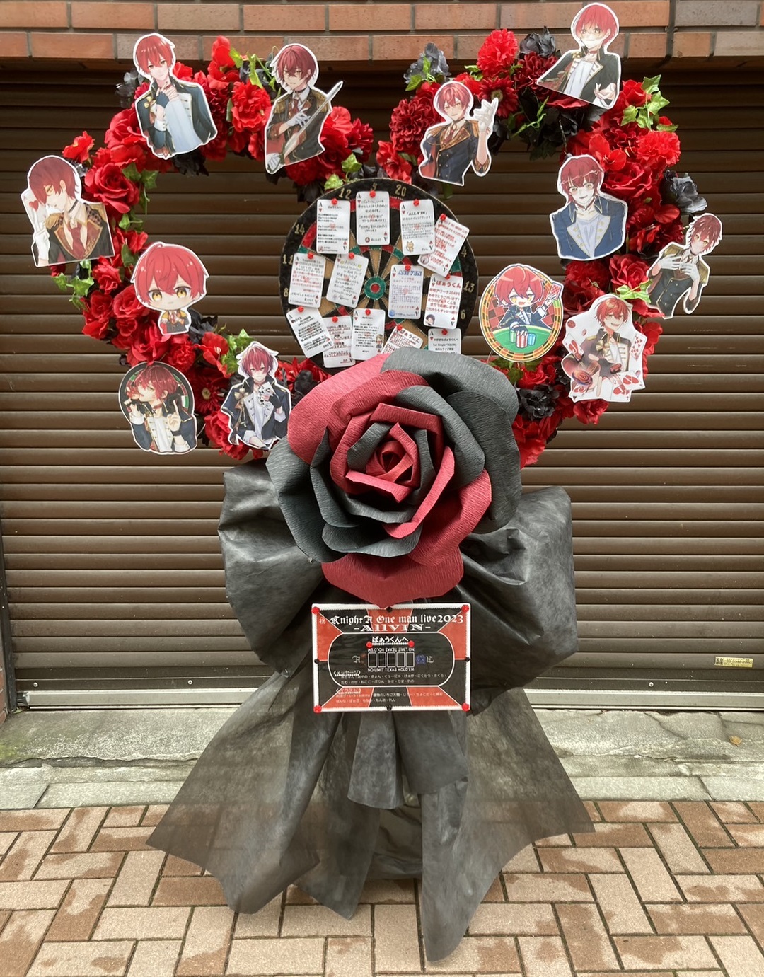 情熱的な赤とクールな黒のハート型フラスタ。イケメンキャラパネルが煌めき、華やかで力強い世界観を表現。