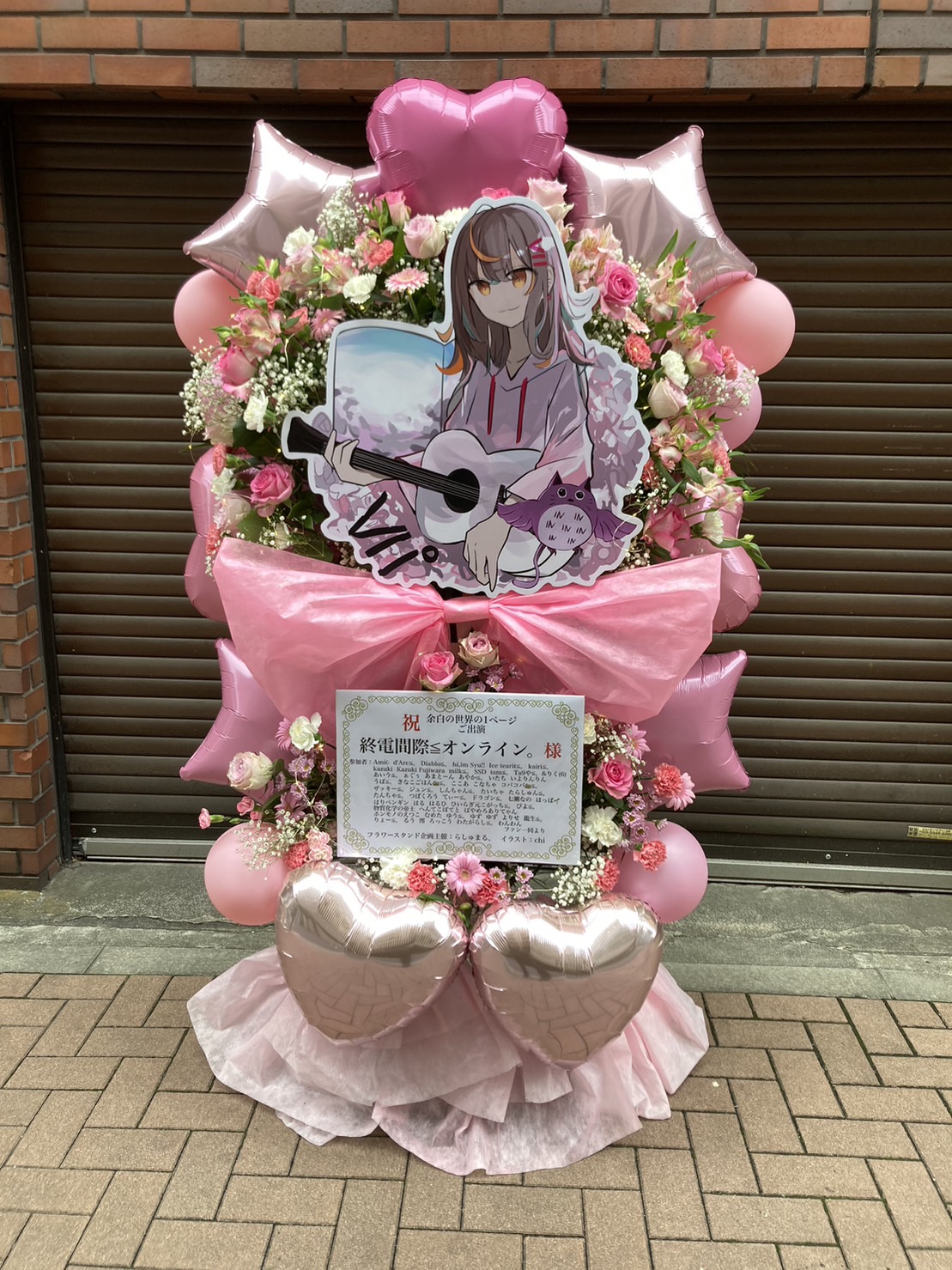 パステルピンクと白を基調とした、生花とバルーンが可愛らしいフラスタ。中央のキャラクターパネルがイベントを華やかに彩ります。