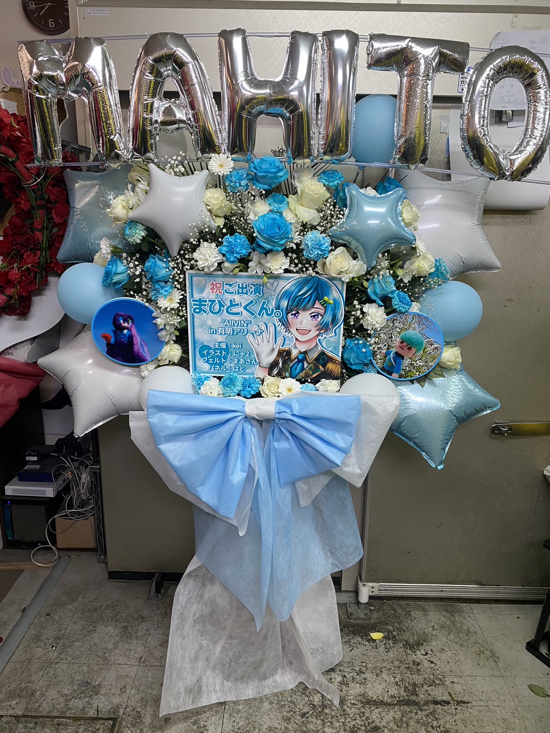 水色と白の爽やかな色合いでまとめられたフラスタ。まひとくんのご出演を華やかに彩るデザインです。