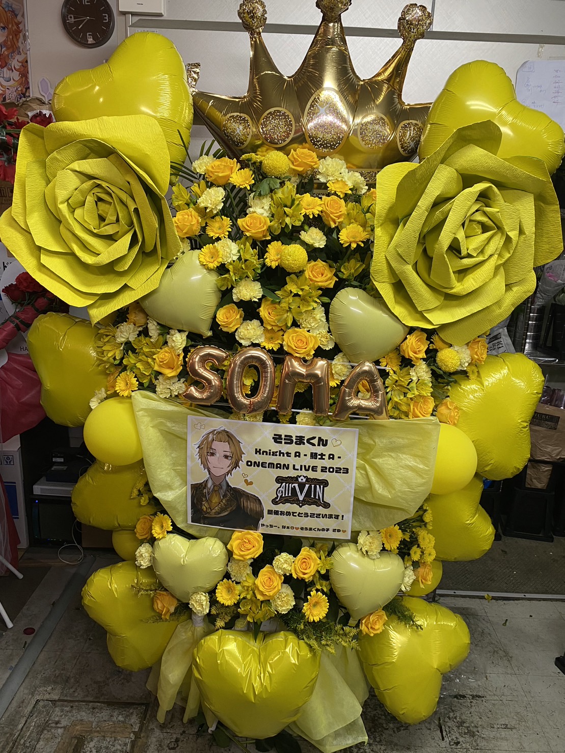 KnightAそうまさんへ贈られた、黄色の生花と王冠・ハートバルーンが輝くゴージャスなフラスタ。ライブ会場を華やかに彩ります。