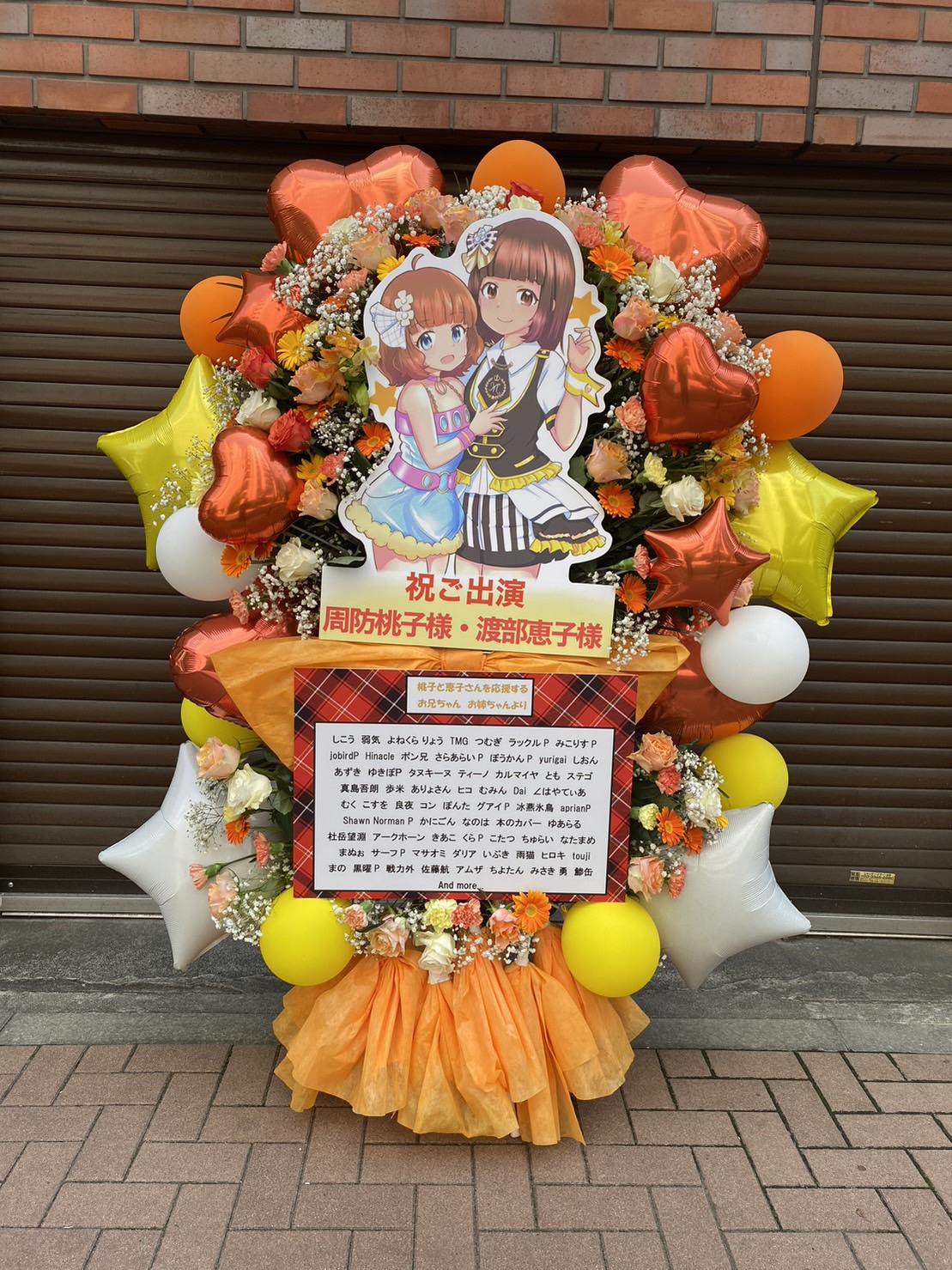 オレンジや黄色を基調に、バルーンと生花が豪華なフラスタ。アイドルらしい華やかさで、イベントを盛り上げます。