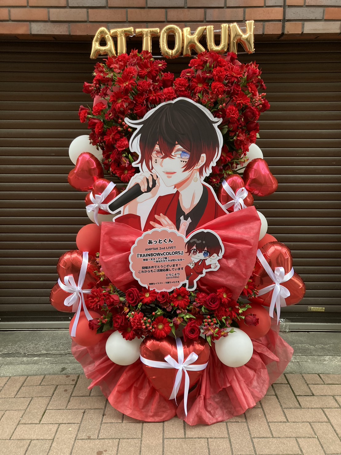 真っ赤な生花とバルーンで彩られた、情熱的で華やかなフラスタ。メインのキャラクターパネルが目を引くデザインです。