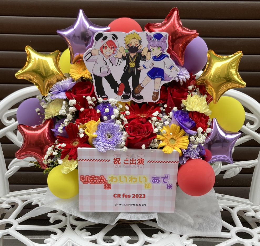CR FES 2023に贈られた、赤・黄・紫が華やかなフラスタ。カラフルな生花とバルーン、キャラクターパネルが賑やかなお祝いを演出しています。