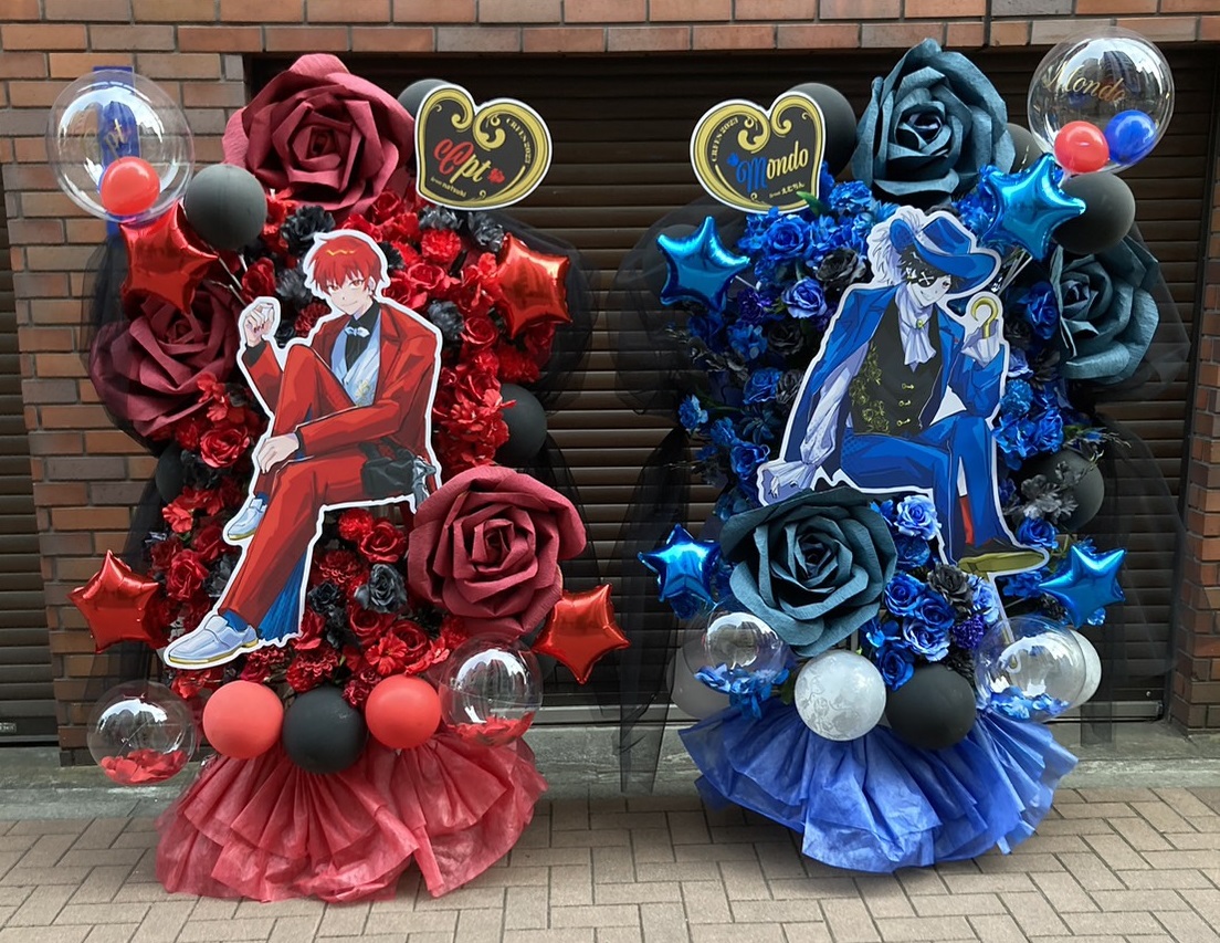 赤と黒、青と黒を基調とした、情熱的かつクールなフラスタ。キャラクターパネルとバルーンが華やかに祭典を彩ります。