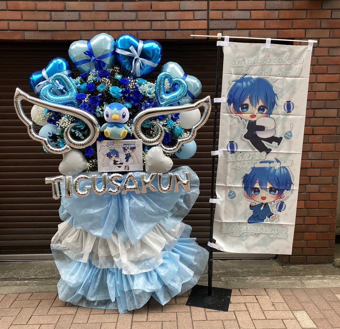 爽やかな青と白を基調とした、幻想的なフラスタ。バルーンと生花、大きな翼で華やかにライブを彩ります。