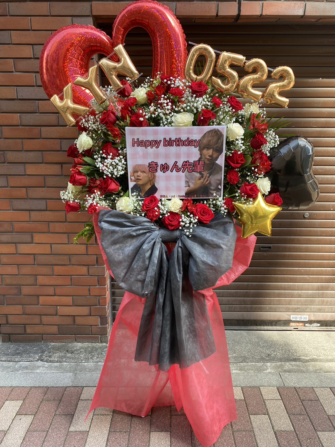 赤と白のバラが豪華に咲き誇るフラスタ。黒とゴールドのアクセントで、華やかさとクールさを兼ね備えたお祝いのデザインです。