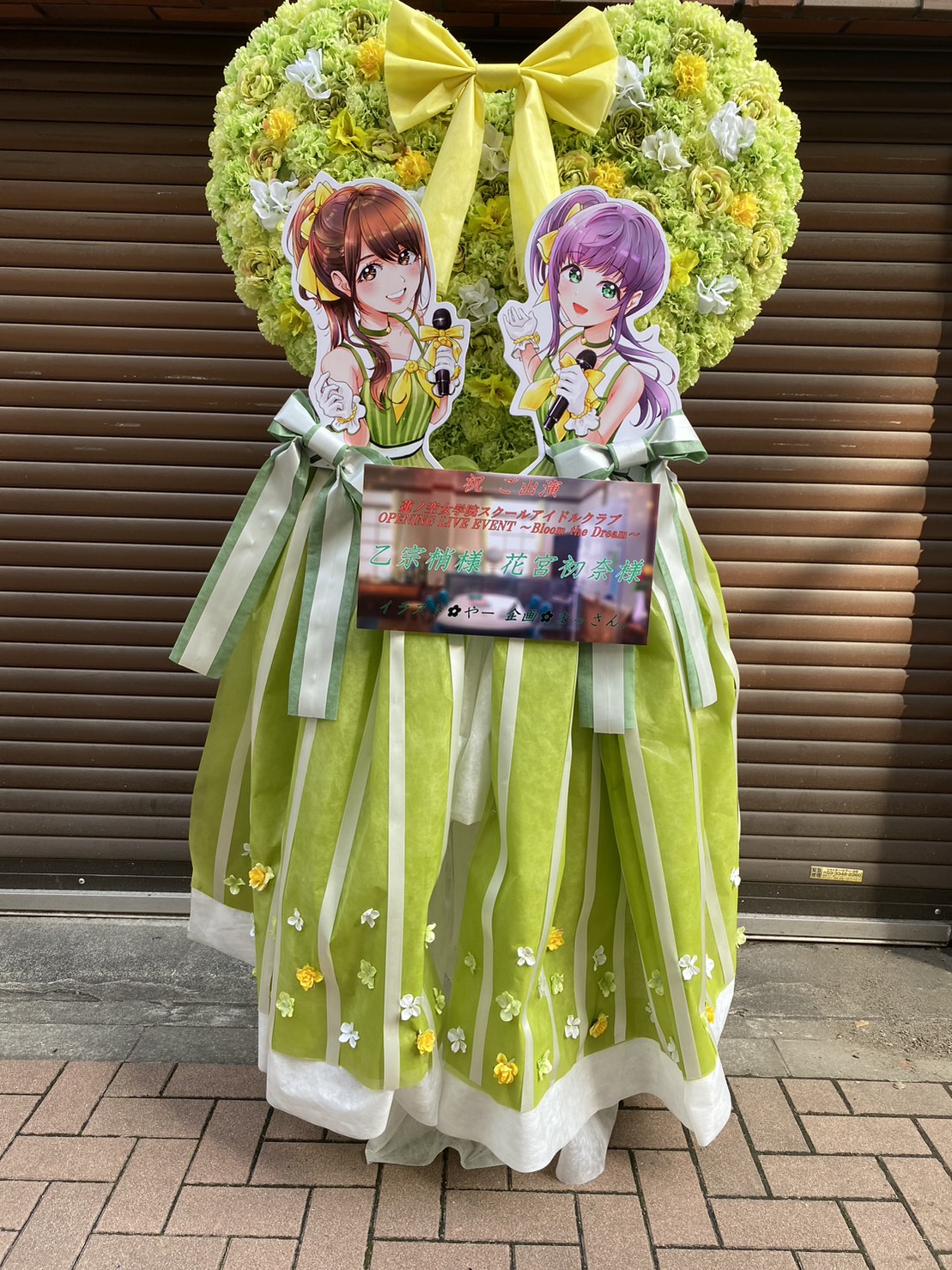ラブライブ!蓮ノ空のイベントを祝う、緑と黄色の爽やかなフラワースタンド。ハート型の生花と華やかなパネルが会場を彩ります。