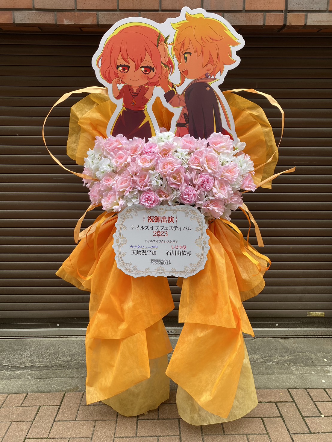 テイルズオブフェスティバル2023へのお祝いフラスタ。明るいオレンジを基調に、ピンクと白の生花が華やかさを添え、キャラクターパネルが目を引きます。