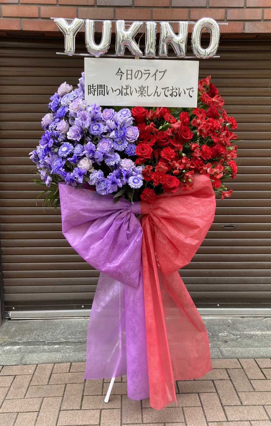 紫と赤の生花が鮮やかなフラスタ。バルーンで飾られた名前が、ライブの主役を華やかに演出します。