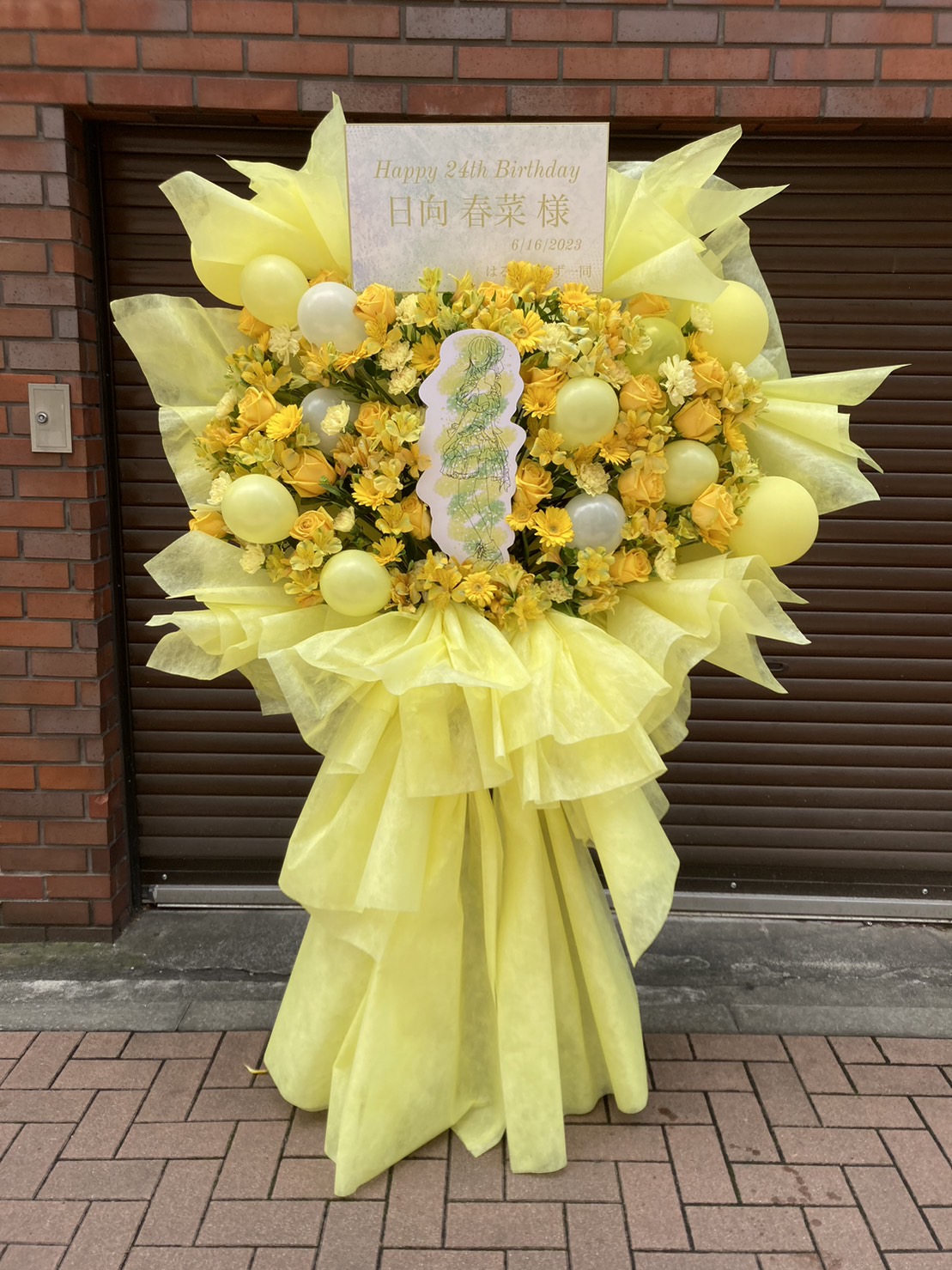 日向春菜様へ贈られた、鮮やかな黄色がメインの華やかなフラスタ。生花とバルーンで明るいお祝いの雰囲気を演出しました。