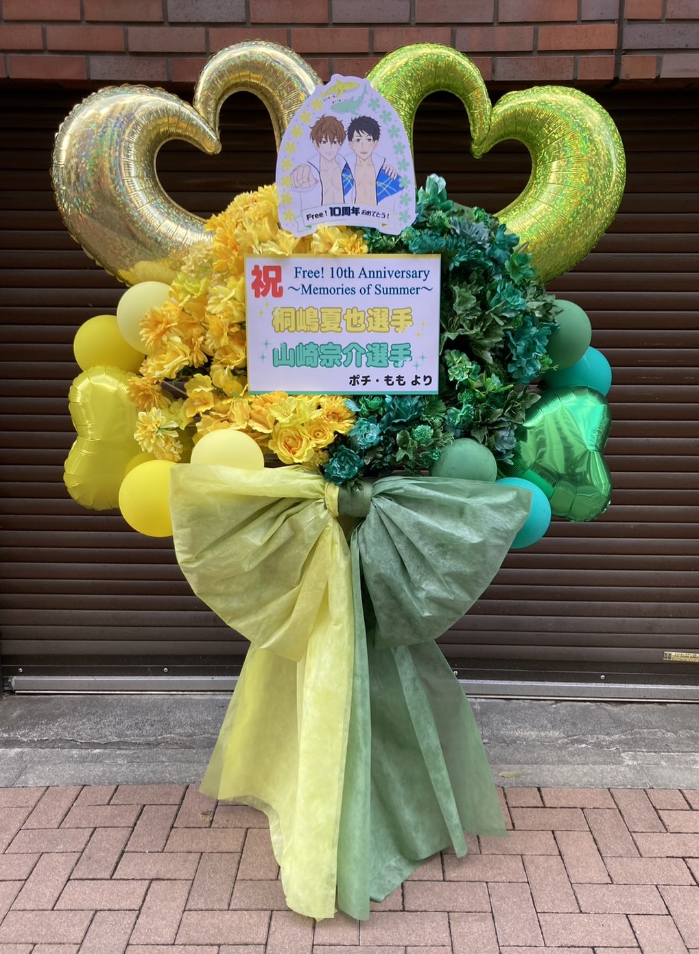Free! 10周年を祝う、鮮やかな黄色と緑が目を引くフラスタ。バルーンと生花が爽やかな雰囲気を演出し、キャラクターへの愛が溢れます。