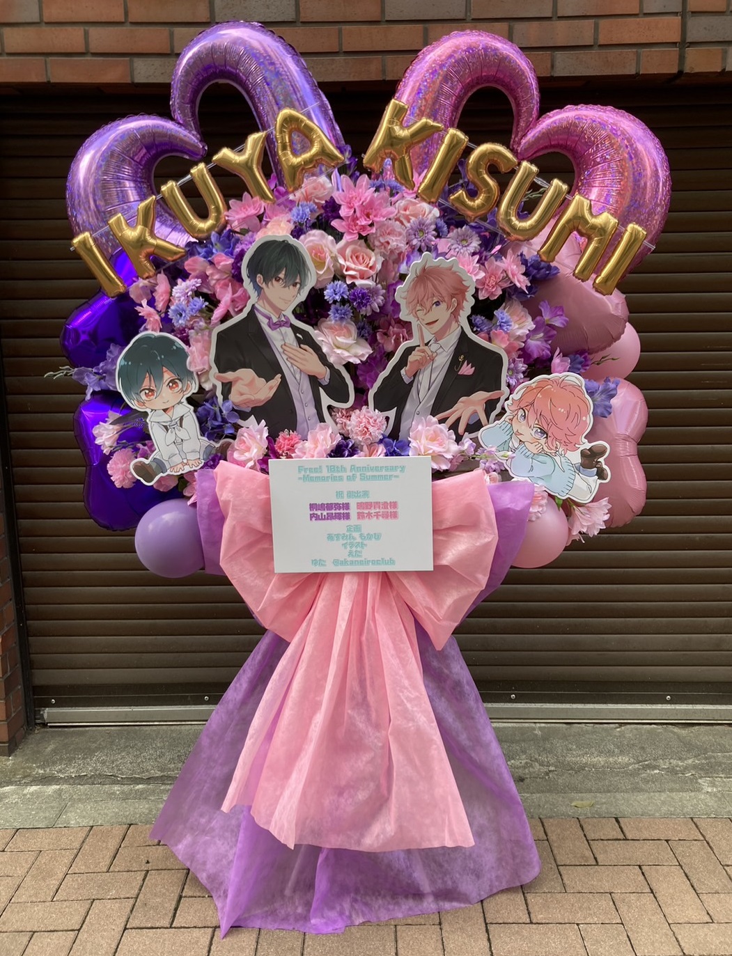 「Free!」10周年イベントへのお祝いフラスタ。紫とピンクを基調とした華やかな色合いで、キャラクターパネルが目を引きます。
