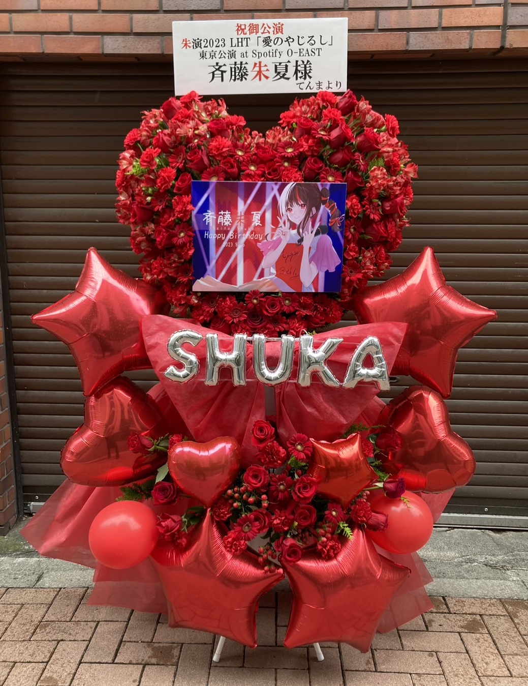 斉藤朱夏さんのライブを祝う、情熱的な赤で統一された華やかなフラスタ。ハートの生花とバルーンが誕生日の祝福ムードを盛り上げます。