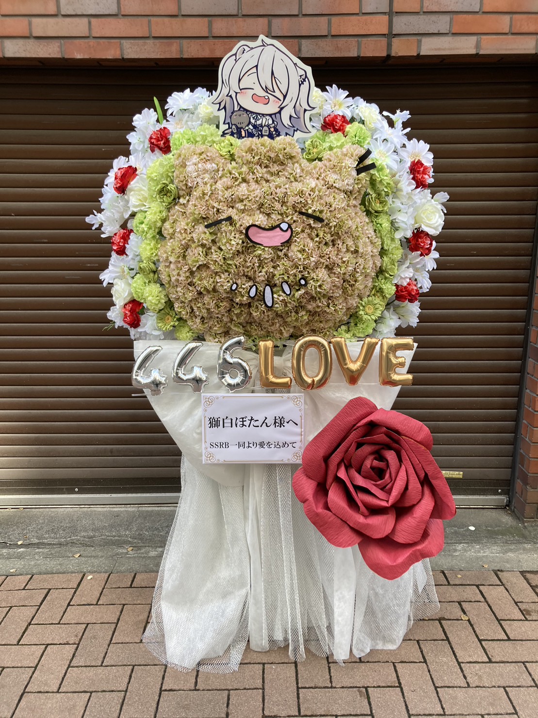 獅白ぼたんさんへのフラスタ。ベージュとグリーンの可愛らしいキャラクター装花に、白と赤が華やかさを添えるデザイン。