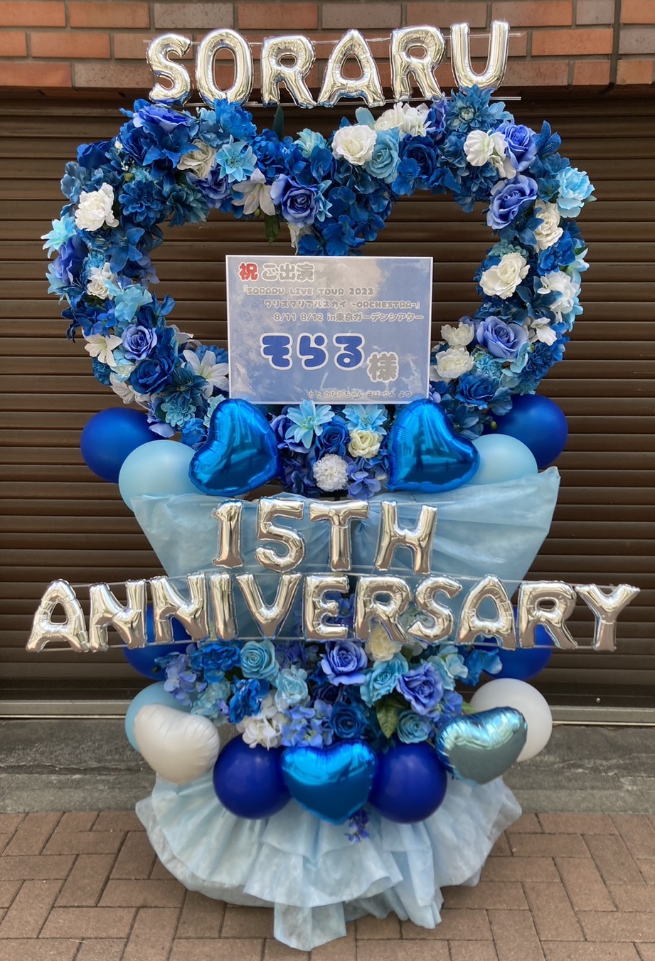 そらる様の15周年を祝う、青と白を基調とした爽やかで華やかなフラスタ。バルーンと造花がイベントを彩ります。