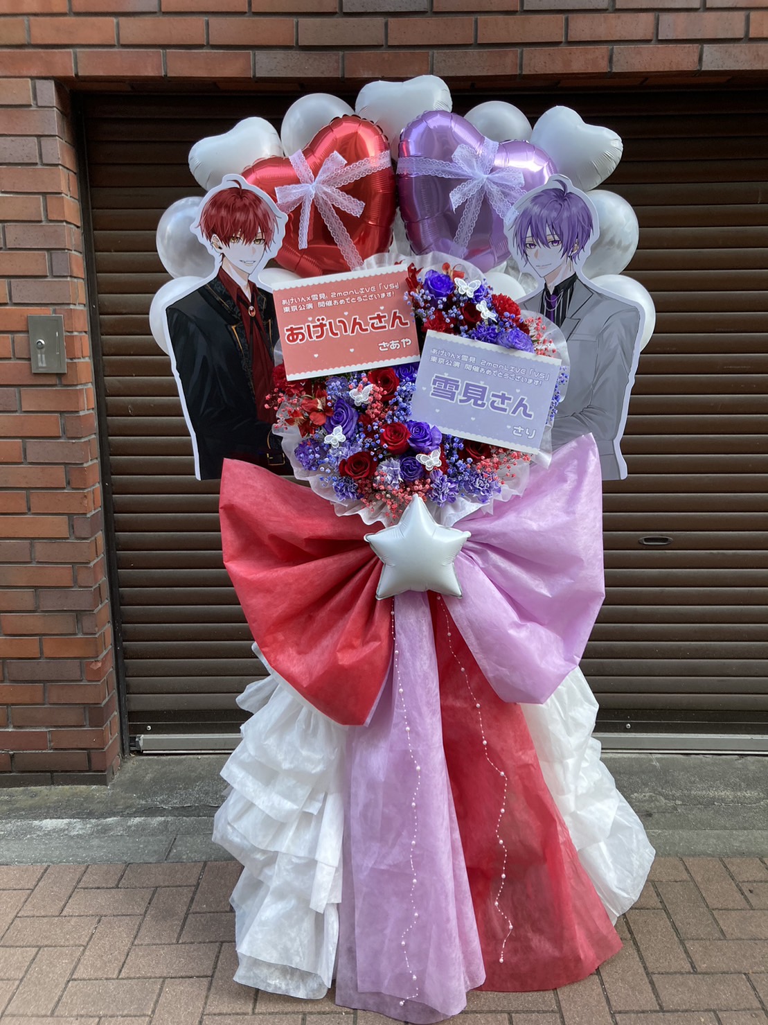 あげいん×雪見 2man LIVE『VS』へのフラスタ。赤と紫を基調に、キャラクターパネルやハートバルーンで華やかに飾られ、二人のライブを盛り上げる情熱的なデザインです。