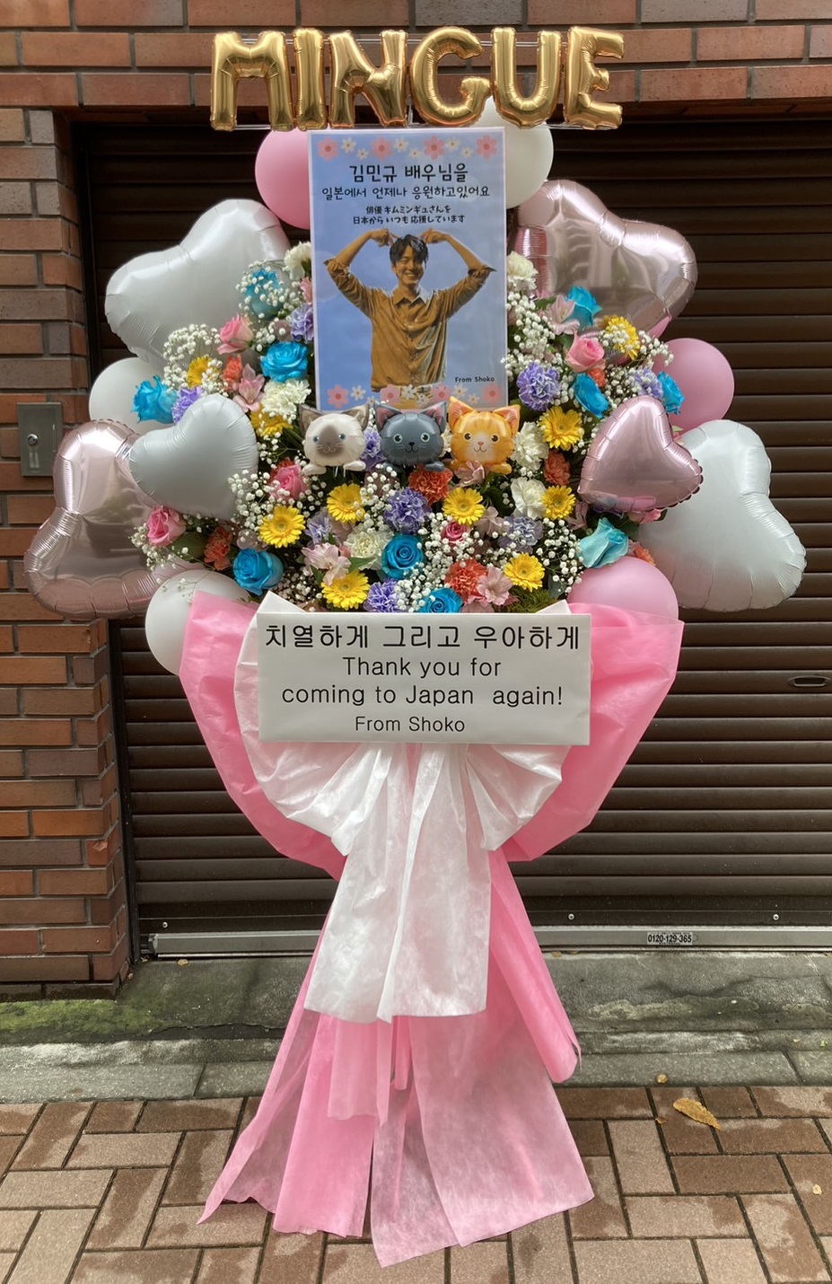 Kim MinGueさんのファンミーティングへ。ピンクと白を基調に、カラフルな生花とバルーンが華やか。温かい応援が伝わるデザインです。