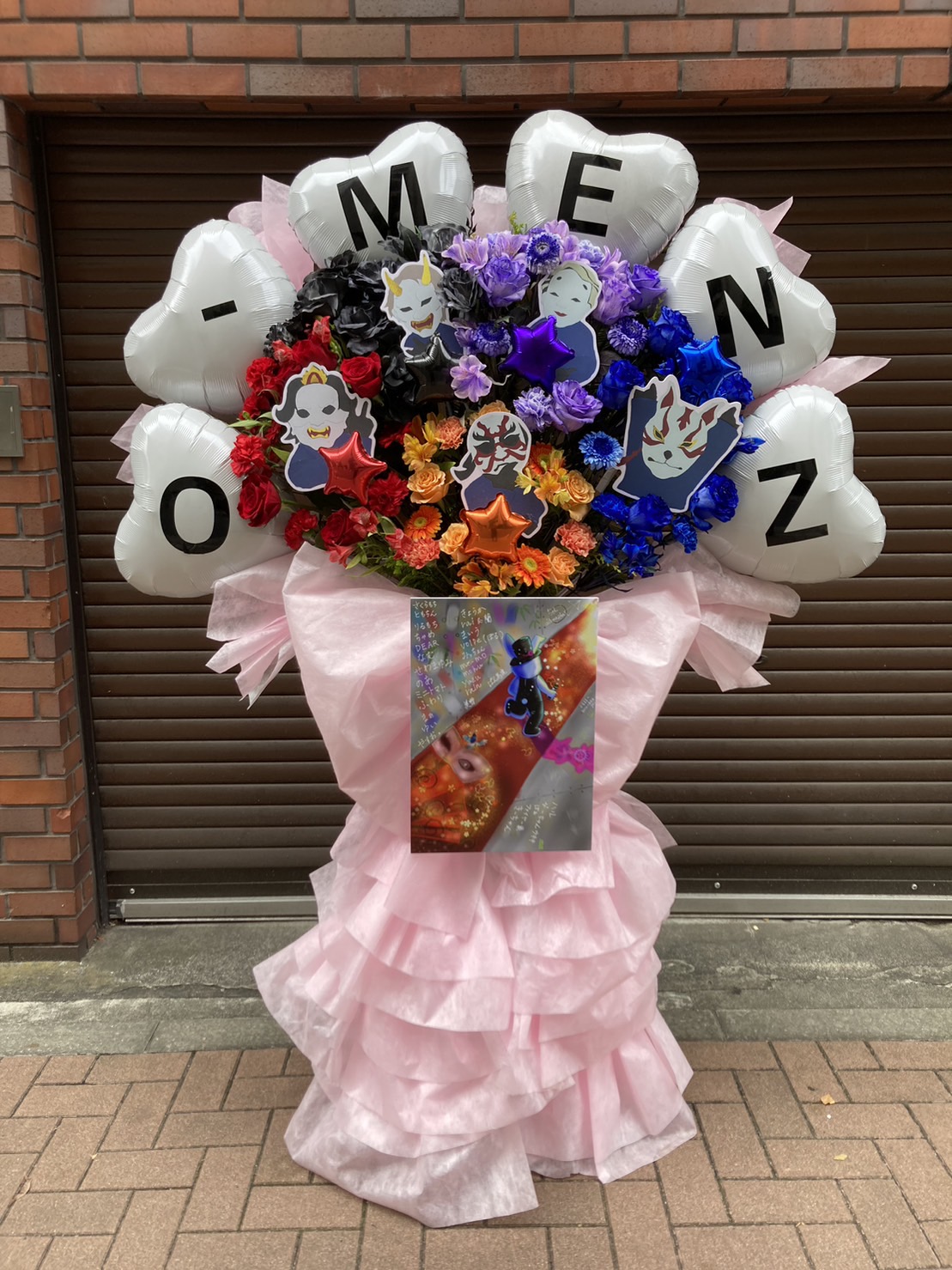O-MENZの個性豊かなメンバーカラーを表現した、鮮やかな生花とバルーンが目を引くフラワースタンド。ピンクのフリルも華やかさを添えています。